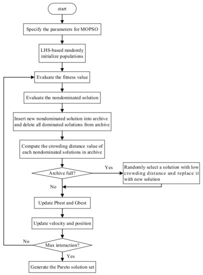 The traditional PSO is designed with single-objective optimization and cannot be directly applied to multi-objective problems. In this study, MOPSO was adopted for multi-objective problems to avoid conflicting solutions owing to its dependency on individual objectives [37]. In MOPSO, the search capability of the swarm-based algorithm is combined with the Pareto optimality properties. The nondominated solutions are recorded in the external archive during the iterative process. Any nondominated solution in the external archive can be selected as the global best (Gbest). The velocity and position of the particles are updated using (8) and (9). For single-objective PSO, there is only one global best solution; however, for MOPSO, the global best solution is a set of solutions. Particle swarms gradually move towards the main goal, moving through the local and global best solutions. During the iterative process, the external archive accumulates all nondominated solutions. The final result is the Pareto front solution. In addition, the crowding distance procedure is used to select the appropriate global best solution and to evaluate the insertion and deletion of non-dominated solutions, especially when the external archive is full. Figure 4 shows the flowchart of the proposed MOPSO algorithm.