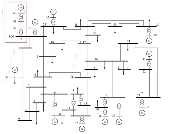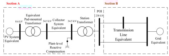 The test system used in this study is shown in Figure 5. Section A is the equivalent circuit of a large-scale PV power system connected to the Section B grid via an equivalent transmission line from the point of interconnection (POI). During the parameter tuning process, contingency events result in various voltage disturbances in power systems. A contingency study was conducted to confirm the security of the PV connected to the power grid.