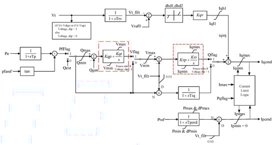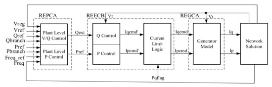 - REECB model: As shown in Figure 7, the REECB model can simulate inverter behavior under different system states. The inverter controller strategies can be divided into real and reactive power control. Real power control is determined by the control signal at the previous level and remains between the maximum and minimum references. Reactive power control includes regulating reactive powers by iqinj during high- and low-voltage disturbance events and stabilizing the output using the PI controller under normal scenarios. The model output can be used to approximate the system responses by adjusting the controller parameters.