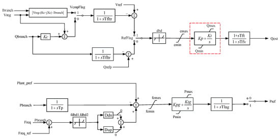 Figure 7. REECB control block diagram. - REPCA model: As shown in Figure 8, the REPCA model primarily receives the feedback response from the POI. The real P/F and Q/V control modes of all inverters in the PV systems can be realized using the REPCA model. The bus voltage and reactive power flow at the POI can be regulated in the reactive power control mode, in which PI controllers provide a primary frequency response according to the system frequency variations.