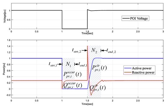 To achieve the objective of tuning the PI controller parameters under different operating voltage scenarios, in this study, the real and reactive power dynamic responses were used as the objective functions. As shown in Figure 9, the dynamic features of the real power responses (, ) and reactive power responses (, ) under fault disturbances during the occurrence period () and recovery period () were used to minimize the average absolute error between the power responses of each shaded zone (see Figure 9) and the reference powers (, , and ). The objective functions used in this study are shown in (22)–(25):