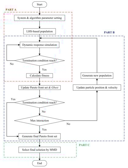 The parameters of a dynamic model often require repeated tuning. In this paper, a tuning process is proposed to search for the Pareto front solutions of dynamic parameters using MOPSO. The most suitable solution is selected using the minimum Manhattan distance method. A flowchart of the proposed parameter tuning method is shown in Figure 10 with the following steps: