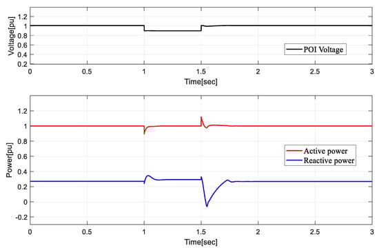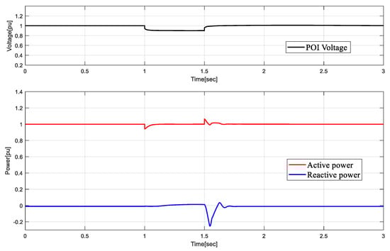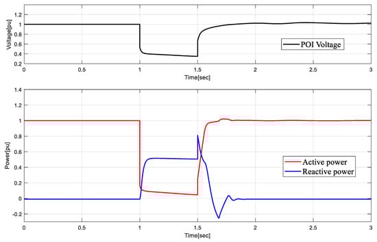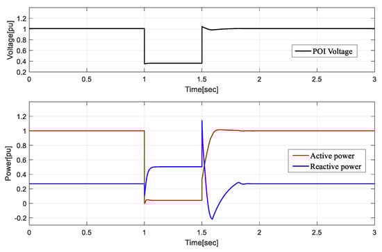 Under different operating scenarios, the generic model may provide real and reactive power responses to power grids according to voltage deviations. It can also be used as a fault compensator or a stability controller. The dynamic response of the test system with a three-phase short-circuit fault for 5 s at the POI is illustrated in Figure 9. Massive fluctuations were observed in both the real and reactive powers. This study proposes tuning the controller parameters to meet the preset reference powers by the system operator in both the shaded zones, as shown in Figure 9.