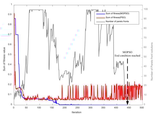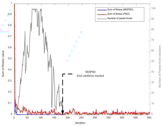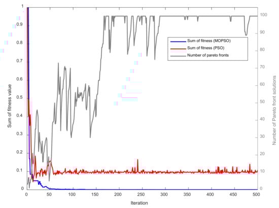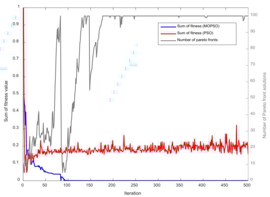 - The performance of each objective feature in MOPSO is better than that of the single-objective weighting sum method. The lowest fitness values for IEEE 39 using MOPSO and PSO were 6.82 × 10−10 and 7.34 × 10−6, respectively, whereas the highest value using MOPSO was 1.76 × 10−7, and the highest value using PSO was 4.88 × 10−4. In other words, the MOPSO method is superior to the standard PSO method.