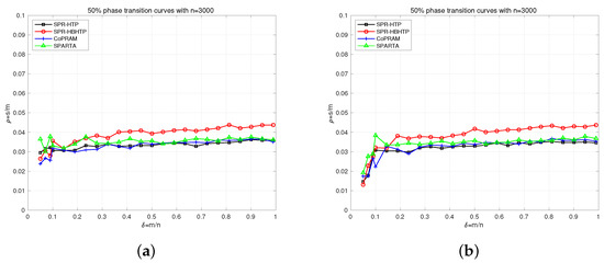 The maximum number of iterations for all algorithms was set as 50. All initial points of the algorithms were generated by initialization in SPR-HBHTP, in which two initial points were produced for SPR-HBHTP, while the other algorithms just needed an initial point . The algorithmic parameters of SPARTA were , , and [38], and the stepsize of SPR-HTP was set as [15]. The choice of algorithmic parameters for SPR-HBHTP is discussed in Section 4.1. For each sparsity level s, 100 independent trials were used to test the success rates of the algorithms. The trial was said to be a ’success’ if the following recovery condition