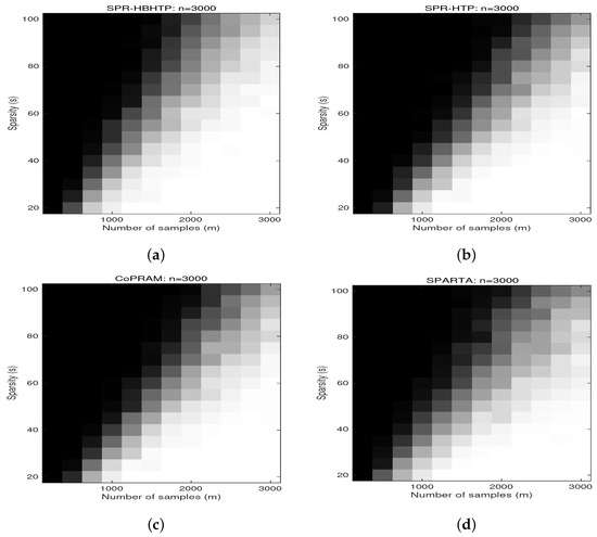 Grayscale maps for different algorithms, such as SPR-HBHTP, SPR-HTP, CoPRAM and SPARTA, with signal lengths of n = 3000 are displayed in Figure 3. In our experiments, the sample size m ranged from 250 to 3000 with a stepsize of 250 and the sparsity s ranged from 20 to 100 with a stepsize of 5. By comparing the four graphs in Figure 3, it can be seen that when the sparsity is relatively large, the recovery ability of SPR-HBHTP is stronger than that of other algorithms. For smaller sparsity s values, SPR-HTP and CoPRAM have almost the same recovery ability, and similarly, SPARTA and SPR-HBHTP have comparable recovery abilities. This is consistent with our results for phase transition curves.