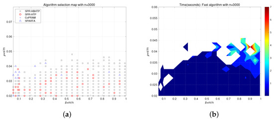 where the intervals and are equally divided into 20 and 40 parts, respectively. For each , we tested 10 problem instances at for each algorithm with an increase in until the success frequency was less than 50%. The ASM and average runtime of the fastest algorithm with accurate measurements are summarized in Figure 4. Figure 4a indicates that SPR-HBHTP or SPR-HTP is the fastest algorithm in most areas, and CoPRAM is a slower algorithm relatively, since it does not appear in the ASM. Figure 4b shows us that the average runtime of the fastest algorithm is less than one second in most regions, and it increases by up to 3–7 s for larger and . This demonstrates that all algorithms will take more time, as the sparsity level s becomes larger.
