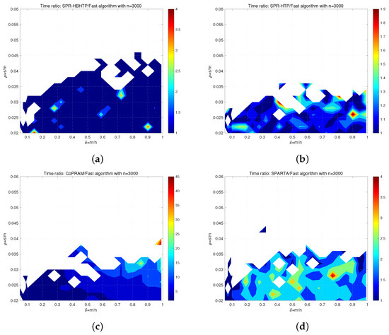 For comparing the algorithms thoroughly, we collected detailed information about their average runtimes, as shown in Figure 5, and the ratios of the average runtimes for the algorithms against the fastest one are shown in Figure 4b. Figure 5a,b reveal that the ratios of SPR-HBHTP and SPR-HTP are close to 1 in most areas, which indicates that they are faster than CoPRAM and SPARTA. In particular, the advantage value of SPR-HBHTP lies in the region with a larger compared to SPR-HTP. In Figure 5c, the ratio of CoPRAM is about 5–20 in most regions, and the minimum value is 5, which means that it is slower than the other three algorithms. Finally, by comparing Figure 5d with Figure 5a–c, we find that SPARTA is slower than SPR-HBHTP and SPR-HTP in most cases, but it is much faster than CoPRAM.