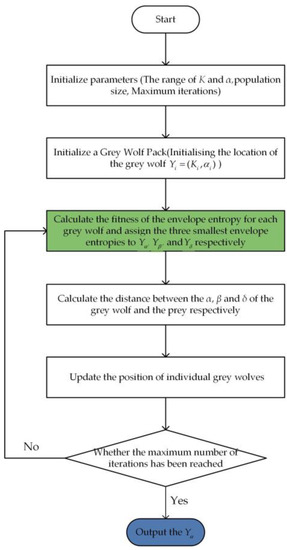 - Calculate the envelope entropy of each grey wolf with Equation (22). The positions of the three grey wolves with the lowest envelope entropy values are updated by , , and , respectively. with the best fitness value is recognized as the optimal solution.