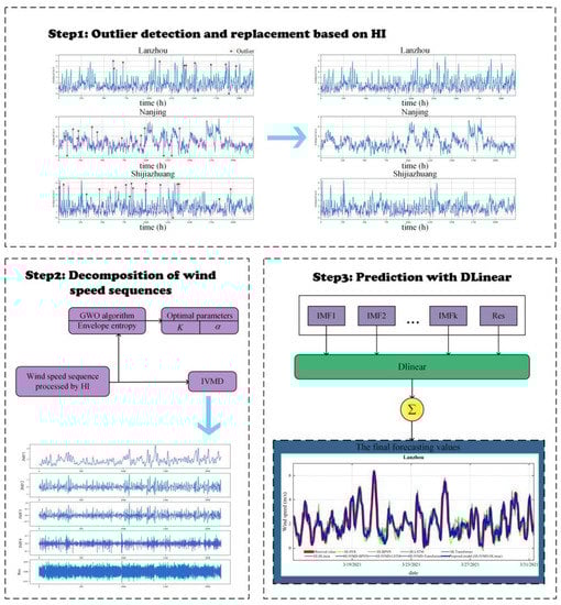 The HI-IVMD-DLinear model is designed to achieve accurate multi-step WSF. The basic framework of this hybrid WSF model is illustrated in Figure 3, which mainly consists of three steps as follows: