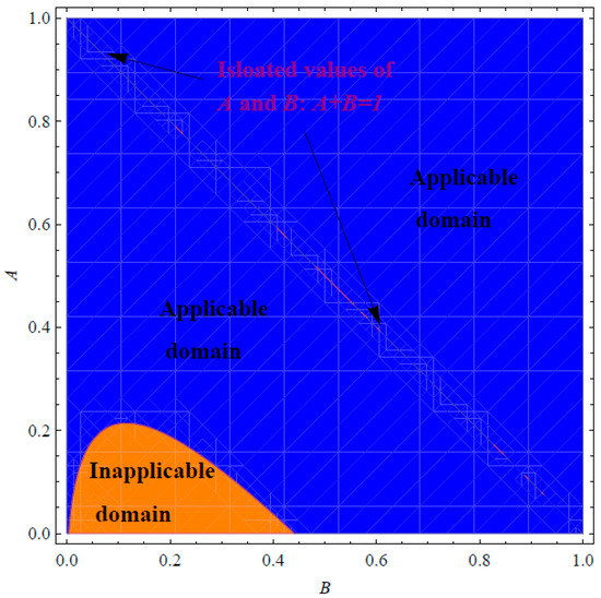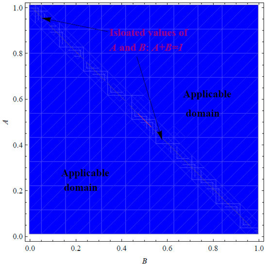 Before launching into the main target of this section, we may shed some light on the domains of applicability/inapplicability for the expressions of and in Equations (31) and (53), respectively. It can be noted from Figure 1 that the approximation is applicable in certain domains for A and B when . However, Figure 2 shows that the corresponding approximation , at , is applicable in all possible domains of A and B provided that is not satisfied, i.e., . Actually, it can be declared that the restriction leads to exact expressions of and . In such cases, the PSS (13) reduces to