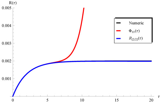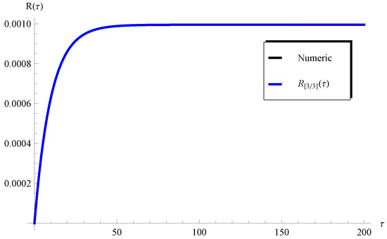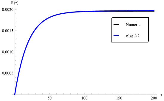 Such a limitation can be easily overcome through considering a higher-order Padé approximant, as will be demonstrated later. On the other hand, one can see from Figure 8 () and Figure 10 () that the curves of the are in full agreement with the numerical ones in the whole domain of . In order overcome the limitations mentioned above, the higher-order Padé approximant is depicted in Figure 11 and Figure 12 at and , respectively. It is clear from these figures that the approximation agrees with the numerical solution in the whole domain. Moreover, the residual error for Equations (1) and (2) is depicted in Figure 13 and Figure 14 using the current Padé approximants and . Furthermore, numerical comparisons are performed between the present PSS , , , and the with the ERKM in Table 1 and Table 2.