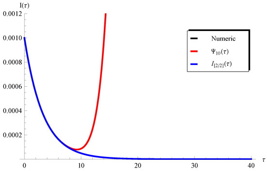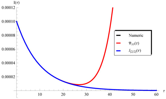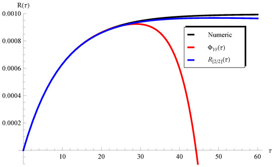 In addition, Figure 3 and Figure 4 show the applicability/inapplicability domains of and at . In Figure 5, the curves of the PSS and the Padé approximant are compared with the numerical solution at , , and . This figure indicates that the domain of agreement with the numerical solution is increased through , while the PSS coincides with the numerical solution in a short domain. Furthermore, Figure 6 confirms this conclusion regarding the Padé approximant and the PSS . Similar results can be seen in Figure 7, Figure 8, Figure 9 and Figure 10. It can be observed from Figure 7 () and Figure 9 () that the difference between the and the numerical solution slightly increases at large values of but the is still better than the PSS .