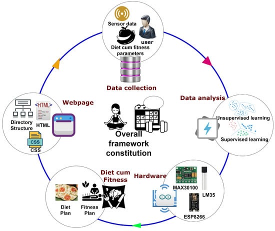 In recent times, the human population has been facing numerous health issues, including fitness problems, improper eating habits, mental health disorders, and more. Maintaining a healthy diet not only makes us feel good but also provides us with increased energy, improved overall health and well-being, and a boost in mood. Both physical and mental fitness are crucial aspects of a fulfilling life. By adopting a balanced diet and incorporating regular exercise into our routines, we can enhance our health and fitness levels. The personalized health monitoring framework, coupled with a diet and fitness recommendation system, offers a novel solution to modern healthcare by integrating technology with individualized health tracking and management. Its primary goal is to provide users with a streamlined and effective approach to monitoring their dietary and fitness habits while also offering personalized recommendations and guidance to help them achieve their health goals []. Given the rising prevalence of chronic diseases and lifestyle-related health concerns, a personalized health monitoring framework empowers individuals to take control of their health and improve their overall well-being. The authors in ref. [] made use of recent technological advancements to facilitate the transformation of traditional healthcare systems into smart healthcare systems. They leveraged wearable devices and connectivity to enhance healthcare management through improved efficiency, convenience, and personalization.