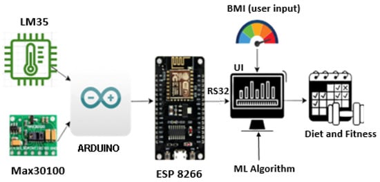 Here, the framework developed for monitoring the health of individuals aged 17–24 is based on the analysis of a generated dataset. Figure 2 shows the block diagram of the framework, which utilizes the Max30100 sensor for detecting blood oxygen levels and pulse rate and the LM35 sensor for measuring body temperature. The Arduino UNO is responsible for collecting and displaying the sensor data on an LCD screen, which can be accessed in real-time via an RS32 serial connection and a front-end/back-end interface. To assess one’s health state (fit, medium risk, and high risk), an ML algorithm is used on the backend. Depending on the health state, personalized recommendations for diet and exercise are provided [].