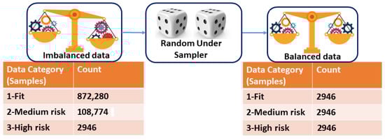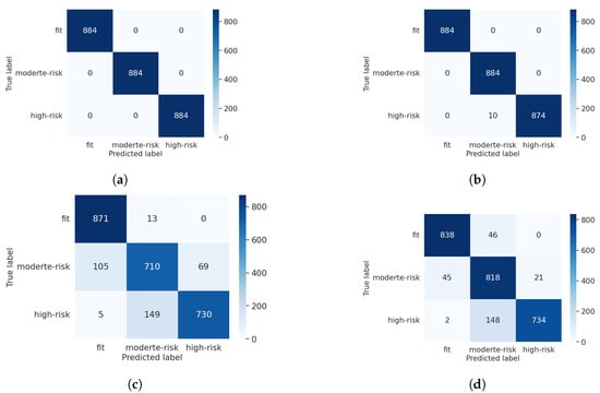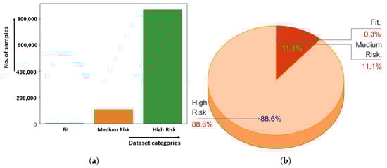 This study’s dataset distribution is illustrated in a pie chart, as shown in Figure 3b. Among the total samples, 88.65% were classified as high risk, 11.05% as medium risk, and only 0.30% were considered fit, where labels 1, 2, and 3 indicate fit, medium risk, and high risk, respectively.