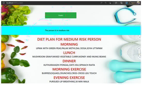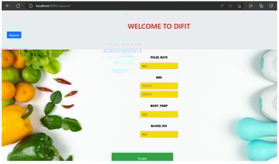 The data obtained in real-time from the hardware is processed and utilized in a Jupyter Notebook to create a Flask web framework. Through the request button, the data is directly sent to the web server, as depicted in Figure 11. Subsequently, based on the health status, diet, and fitness of the user, recommendations are made, as shown in Figure 12. Table 6 shows the comparison of the results obtained from this work in association with the works in the literature in terms of prediction accuracy and complexity in terms of Big-oh representation.