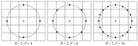 where P and R stand for the total number of neighbors and the radius of the neighborhood, respectively, is an arbitrary pixel of image I and represents a neighboring pixel of . Figure 2 shows examples of samplings with R = 2 and P = 4, 8, 16, respectively.