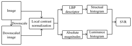 In [44], normalized LBP histograms from different scales are formed as the quality-concerned features. Li et al. [45] proposed a no-reference quality assessment method using statistical structural and luminance features (NRSL). Figure 3 shows the framework of NRSL, in which the distorted image and downscaled images are normalized using Formula (2), and the LBP histogram and luminance histogram are then extracted over multiple scales to form the quality features.