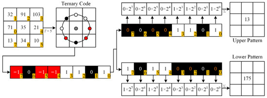 where T is a threshold value that is same as in Equation (10). The ternary pattern is further split into an upper pattern and a lower pattern, corresponding to a positive and negative code, respectively. Figure 4 shows the feature extraction procedure of the LTP descriptor for a single pixel with R = 1, P = 8 and T = 5. The step function (i.e., Equation (11)) is computed in an order denoted by the numbers in the yellow squares. Different from the LBP descriptor, the LTP descriptor generates three possible values, including −1, 0 and 1, which are represented by the red, black and white colors in Figure 4. The LTP code further splits into two LBP codes for the upper pattern and the lower pattern. For the upper pattern, the negative values (i.e., −1) in the LTP code are converted to 0. To create the lower patter, the negative values are converted to 1, and positive values (i.e., 1) are set to 0. The two separate LBP channels are then used to calculate the feature vector.