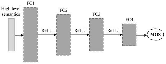 where is an input feature vector, represent the feature and quality score of the i-th training sample, respectively, n denotes the training sample number, and is the spread parameter. Moreover, an MLP, which contains four fully connected layers with the ReLU activation function [68], as shown in Figure 8, is used as a high-capacity regression model in [31] to map high-level semantic features to quality scores. In [69], the authors propose using a DNN model consisting of three hidden layers and one linear regression layer to map extremely large features extracted from a YIQ color space to quality scores. Specifically, each hidden layer is first trained as a sparse auto-encoder to learn the initialization parameters followed by overall fine-tuning.