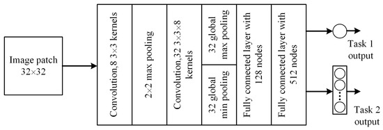 With the development of deep learning technology and the promising performance of convolutional neural networks (CNN) in various computer vision tasks, researchers have attempted to establish end-to-end BIQA models using CNN. Kang et al. [32] proposed a patch-based CNN network, which was one of the earliest end-to-end DNN models for no-reference image quality assessment. The proposed CNN network is composed of one convolutional layer, two pooling layers (one max pooling and one min pooling), two fully connected layers and a regression layer. More details of each layer are summarized in Table 2. The network input is image patches, which are sampled from large images normalized using Formula (2). For the training phase, each patch uses the ground truth score of the original image as its own quality score. The average norm of the predicted score of each patch and its ground truth score are used to form the loss function, and the model is then optimized using the stochastic gradient descent (SGD) optimizer. In the test stage, the quality score of an image patch is predicted by the trained model, in which the prediction score of a test image is computed by averaging the predicted scores of all test image patches.