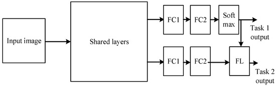 Multi-task is another typical scheme used in BIQA. Kang et al. proposed a multi-task CNN model named IQA-CNN++ for simultaneously estimating image quality and identifying distortion [35]. The model takes normalized image patches from large images using Formula (2). Figure 10 shows the architecture of IQA-CNN++, which is composed of several shared layers and two task layers. The shared layers include two convolutional layers, three pooling layers and two fully connected layers with ReLU activation functions. Both the linear regression layer and the logistic regression layer take the outputs of the second fully connected layer as inputs for quality prediction and distortion identification, respectively. The loss of the quality prediction is the norm of the prediction error, and the loss of the distortion classification is a negative log likelihood. Ma et al. [36] also proposed a multi-task model, namely MEON, which takes large images instead of image patches as inputs. Figure 11 shows the model architecture of MEON for two tasks. The shared layers of the two tasks contain four convolutional layers with generalized divisive normalization (GDN) as the activation function and a max pooling layer after each convolutional layer. Two fully connected layers and one softmax layer are appended to predict the distortion type in task 1. Task 2 utilizes two fully connected layers to generate a quality score for each distortion type. A fusion layer (FL) combines the distortion probability generated by task 1 and the perceptual quality scores for each distortion (i.e., the output of the last fully connected layer) to yield an overall quality score. The first fully connected layer of both task 1 and task 2 also use GDN as the activation function.