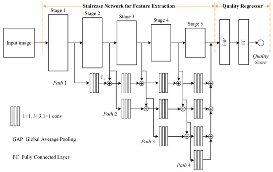 With the ubiquity of image-capture devices and the growth of the internet, digital images are playing an increasingly important role in every aspect of daily life. During the many stages of image handling, including acquisition, transmission, processing, storage, etc., various distortions in image quality may occur. Image quality assessment (IQA) has become an important need in a wide range of computer-vision-related applications, such as image retrieval [1,2] and visual recognition [3,4]. Humans have the ability to subjectively evaluate the quality of digital images. In fact, this subjective assessment is one of the most reliable methods for IQA [5]. However, subjective quality assessment is laborious and time-consuming. In addition, it is difficult to implement it in real-world application scenarios. Thus, considerable effort has been made to develop objective IQA algorithms in the past decades [6,7,8,9].