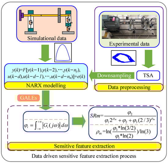 Conventional detection methods based on physical models and signal processing are limited in real-time monitoring. The third method is based on data-driven dynamic modeling [12]. Data-driven models are mainly divided into two categories. The first is to directly use output response to identify dynamics models, such as AR (autoregressive) model [13] and ARMA (autoregressive moving average) model [14]. The second is to consider the external input, such as Volterra series models [15], Hammerstein models [16], NARMAX (nonlinear autoregressive moving average with exogenous inputs) model [17], and NARX (Nonlinear autoregressive with exogenous inputs) model [18]. When the terms of the data-driven model are determined in advance, the coefficients of the terms can be used as the features [19]. However, the number and form of model terms are uncertain in many cases, and the term coefficients cannot be used as fault features. Therefore, the weak fault feature extraction of the data-driven model is also an urgent problem to be solved.