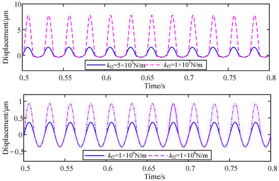 Vibration responses when kf2 = 1 × 109 N/m, 1 × 108 N/m, 5 × 107 N/m, and 1 × 107 N/m.
