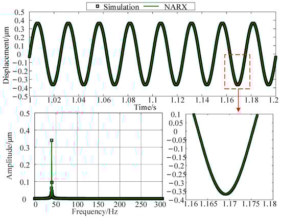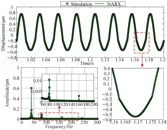 To ensure the accuracy of the identified NARX model, the MPO prediction output of the NARX model and the actual output obtained from the numerical simulation are compared and analyzed in the time domain and frequency domain, as shown from Figure 7, Figure 8, Figure 9 and Figure 10. The predicted output of the NARX model is the same as the original simulation waveform, and the frequency domain characteristics of the first seven times the rotational frequency are consistent. It shows that the NARX model identified under each looseness stiffness has high accuracy and reliability. The effective NARX model lays the foundation for the subsequent NOFRF evaluation and further sensitive feature extraction.