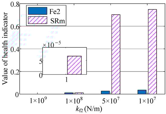 After the identified NARX model has been decomposed by GALEs, the first three-order output of the system can be obtained. Combined with the first three-order input of the system, the NOFRFs can be evaluated with Equation (4). Finally, the sensitive feature indicator SRm can be obtained according to Equation (13). The comparison between SRm under different looseness stiffness and the conventional NOFRFs-based indicator Fe2 is shown in Figure 11. It can be seen that when the looseness stiffness is greater than 1 × 108 N/m, the changing trend of the two indicators is the same, with the looseness stiffness decreasing. When the looseness stiffness is less than 1 × 108 N/m, the indicator SRm is significantly larger than Fe2, indicating that the sensitivity of the new indicator SRm to looseness stiffness is better than that of the conventional NOFRFs-based indicator Fe2.