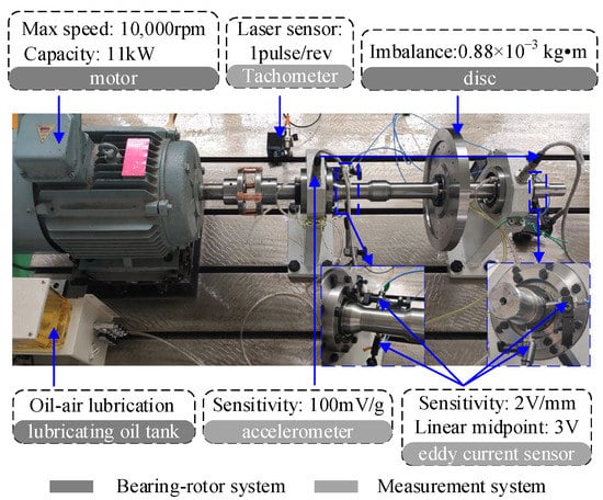The measurement system mainly acquires the vibration displacement signal of the shaft, the acceleration signal of the bearing seat, and the rotational speed signal. The layout of the sensors and their detailed information are shown in the dashed box in Figure 12. The eddy current sensors (model RP660677) were used to measure the vibration displacement in the horizontal and vertical directions of the shaft, respectively. The accelerometers (model BH5031EX-050-VL) were used to measure the vertical vibration acceleration of the two bearing housings at the drive and non-drive ends, respectively. A photoelectric sensor (model OGP700) was used to measure the rotational speed of the shaft through the reflective sheet pasted on the shaft. The NI-9234 card and Cdaq-9178 chassis are used to collect and store the acquired data by the self-made Labview program. The motor speed is set to 2400 rpm, and the sampling frequency fs of the displacement and acceleration signals are both 5120 Hz.