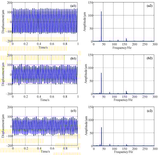 Vibration waveform and spectrum at the non-driving end (a1,a2) No looseness (b1,b2) Slight looseness (c1,c2) Severe looseness.