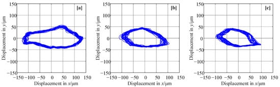 The original horizontal vibration signal of the shaft near the non-driving end under no looseness, slight looseness, and severe looseness is shown in Figure 13. As the degree of looseness increases, the vibration amplitude decreases. The rotor–bearing test rig structure has a lot of mating gaps, and many factors affect vibration, such as assembly. When the degree of looseness increases, the vibration amplitude decreases, which may be due to the initial misalignment of the rotor system. The misalignment weakens gradually when the looseness occurs and deteriorates. This also shows that because the rotor system sometimes couples a variety of faults, the diagnosis of looseness faults simply by using changes in vibration amplitude is unreliable. Therefore, it is necessary to extract sensitive fault features to characterize looseness from the vibration signal better. From the spectrum in Figure 13, the amplitude of rotational frequency decreases, and the amplitude of double frequency increases. As the degree of looseness increases, the lower right part of the orbit becomes more and more “sharp” in Figure 14. It shows that the bearing seat collides with the foundation, consistent with the simulation results.