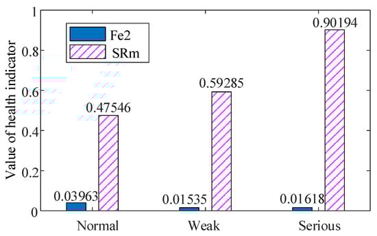 The predicted output of the identified NARX model is compared with the experimental data processed by time synchronous averaging, as shown in Figure 15. The predicted output is highly consistent with the experimental results, which verifies the effectiveness of the NARX model under three different degrees of looseness. The identified NARX model is used to obtain the first three-order NOFRFs using the GALEs method. The second-order optimal weighted contribution rate of NOFRFs indicator SRm proposed in this paper is used to extract sensitive features and is compared with the conventional NOFRFs-based indicator Fe2. The two indicators under different looseness states are shown in Figure 16. As the degree of looseness increases, Fe2 first decreases and then increases. It is not monotonic and cannot be used to detect the change in the looseness state. The new indicator SRm showed a monotonous upward trend, increasing from 0.48 when no looseness occurs to 0.90 when severe looseness occurs, an increase of 89.7%. Therefore, the data-driven sensitive feature indicator SRm proposed in this paper can better reflect the occurrence and deterioration of system nonlinear damage.