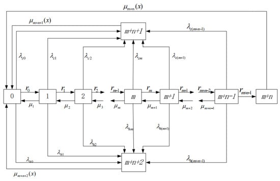 - The failed system repair times are arbitrarily distributed; represents the system’s time-dependent repair rate when the system is in state j and satisfies for j = m + n, m + n + 1, m + n + 2.