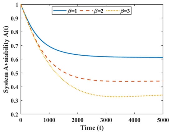 In Figure 2, we describe the influence of different changes with time t on the instantaneous availability of the system ( is another parameter of the gamma distribution). It is easy to see from Figure 2 that decreases rapidly with increased time. After the system runs for a long time, it stabilizes and reaches a fixed value.