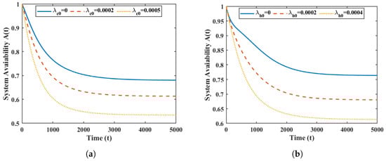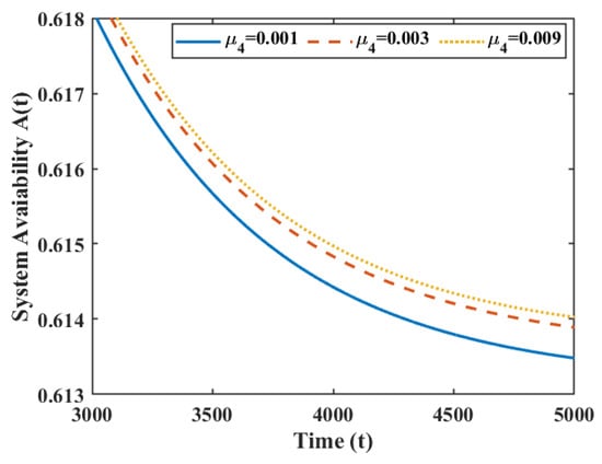 Figure 3a,b show that decreases with increases in and . In addition, as time goes to infinity, the instantaneous availability of the system converges to a certain value.
