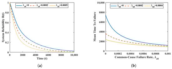 Figure 5 indicates the effect of and on the system reliability and mean time to failure (). We note that (Figure 5a) and (Figure 5b) decrease as increases. Obviously, reliability vanishes as time goes to infinity.