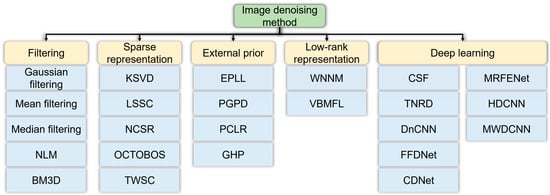 Image denoising is one of the basic tasks of computer vision and is of wide interest to academia and industry, as it can effectively improve image quality. The purpose of image denoising is to remove noise from a corrupted image and restore its original content as much as possible. In many computer vision tasks, image denoising is often used as a preprocessing method to improve the practical performance of advanced computer vision tasks []. Over the past few decades, many outstanding image denoising methods, as shown in Figure 1, have been proposed, including filtering-based [,], sparse-representation-based [,,,,], external-prior-based [,,,], low-rank-representation-based [,], and deep-learning-based methods [,,,].