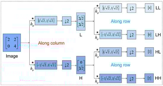 The process of decomposing an image using the 2D Haar wavelet is shown in Figure 2. The blocks with five-pointed stars in the figure are the finite impulse response filter. denotes a low-pass filter, and denotes a high-pass filter. The down arrow () indicates downsampling, which means adding two adjacent pixels in the column or row direction.