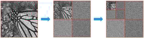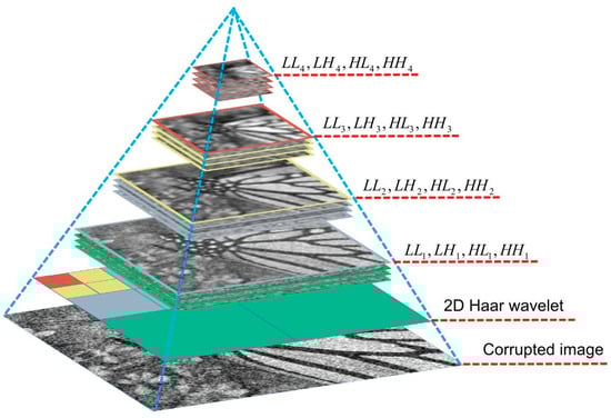 where represents the 2D Haar wavelet, is the corrupted image, is the low-frequency component, and , , and are the high-frequency components. Then, the 2D Haar wavelet is applied once again to the low-frequency component to obtain