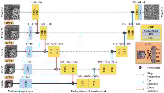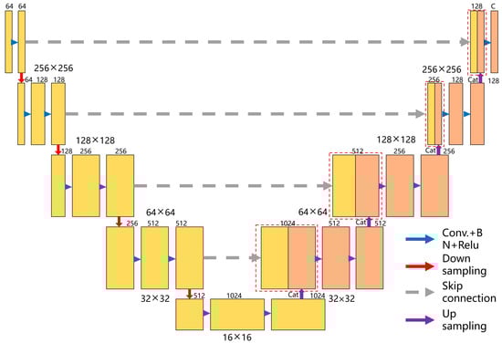 The U-shaped convolutional network was first proposed by Ronneberger et al. []. The network has been widely used in various fields for its powerful encoding and decoding capabilities [,]. The U-shaped convolutional network includes four downsampling operators and four upsampling operators and uses skip connections at the same stage, which not only gives the network the ability to extract multi-scale features but also ensures that the output integrates more low-level features []. The structure of the U-shaped convolutional network with batch normalization (BN) is shown in Figure 4.