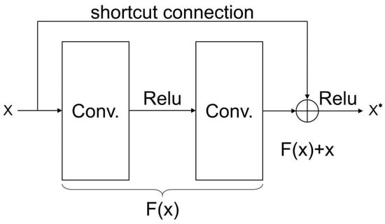 When the network becomes very deep, some convolutional layers may appear to have identity mapping, resulting in degradation problems and vanishing and exploding gradients. To solve this problem, He et al. [] proposed a residual network with the residual block shown in Figure 5. It connects the input and output directly through a shortcut connection, allowing to learn small changes. This not only allows the convolutional layer to maintain identity mapping but also avoids vanishing and exploding gradients. The relationship between the input and output of the residual block is