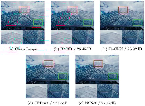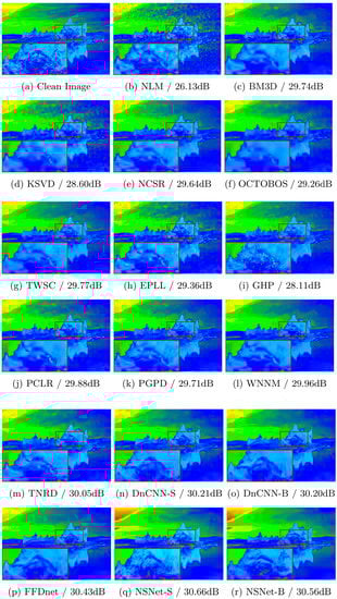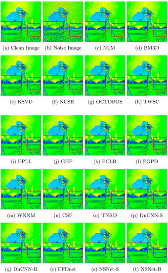 Gray image denoising and color image denoising were carried out to compare the denoising performance of the proposed NSNet with those of existing models, including NLM [], BM3D [], KSVD [], NCSR [], OCTOBOS [], TWSC [], GHP [], EPLL [], PGPD [], PCLR [], WNNM [], CSF [], TNRD [], and FFDNet []. Moreover, two different types of DnCNNs [] were also selected as the compared models. They are DnCNN-S and DnCNN-B, which are trained at known and unknown noise levels, respectively.