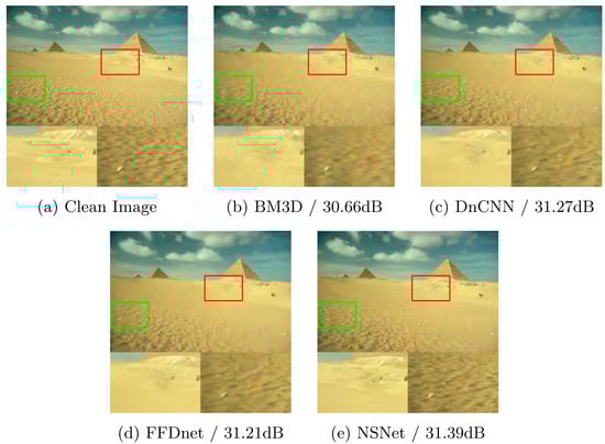 The denoising performance of NSNet is better than that of Unet at all noise levels, which shows that multi-scale input can improve the denoising performance. The results for NSNet and NSNet without BN show that the denoising performance of NSNet is greatly improved after adding the BN layer. As mentioned in [], the BN layer can improve the denoising performance of the neural network. At all noise levels, NSNet without BN achieves better denoising than Unet without BN, and its denoising performance is close to that of Unet at low noise levels, which indicates that the multi-scale input greatly improved the denoising performance of the model at low noise levels. With increases in the noise level, the structure of the compressed image is increasingly corrupted; thus, it cannot provide accurate information for the network. In this case, the performance of NSNet is similar to that of Unet. For example, the denoising performance of NSNet is similar to that of Unet at a noise level of 50.