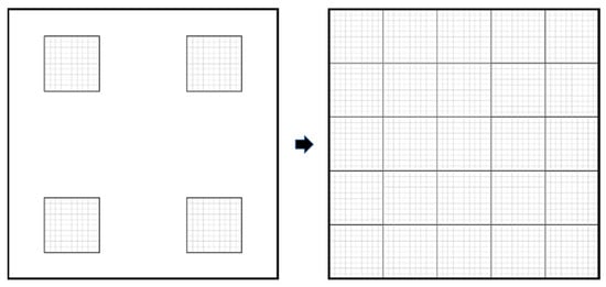 In order to solve the checkerboard problem in the results of Direct FE2-based multiscale topology optimization, we reconstructed the results using bilinear interpolation and filtering. By extrapolating the density values of the RVEs at four integration points, the density values of all RVEs within the macroscale element can be obtained. Then, the interpolated density is filtered by performing a weighted average of the element density within a circular area with a radius of . This is the key step to eliminate the checkerboard problem. In order to improve the efficiency of filtering, this paper proposes an iso-position filtering method. When filtering the density of a certain element, only the weighted average of the element density at the same position in the RVE is performed, instead of all the elements within the circular area. Finally, the reconstructed structure is determined according to the filtered density of the elements.