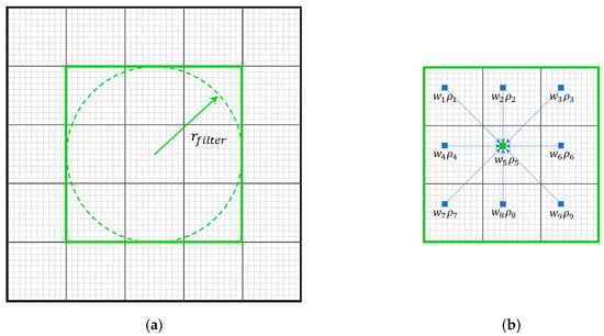 In order to avoid the checkerboard problem and mesh dependency [42], the density filter of elements is performed after interpolating element densities. Different from the traditional density filter method, which takes into account all the elements that fall within the filter radius, an iso-position filter method is proposed here to speed up the filter procedure. There are two steps for the iso-position filter: see Figure 3. Firstly, the RVEs within the filter radius are searched according to the center coordinates of the RVEs. Secondly, the filtered densities of each element in the RVE are calculated using the following formula.