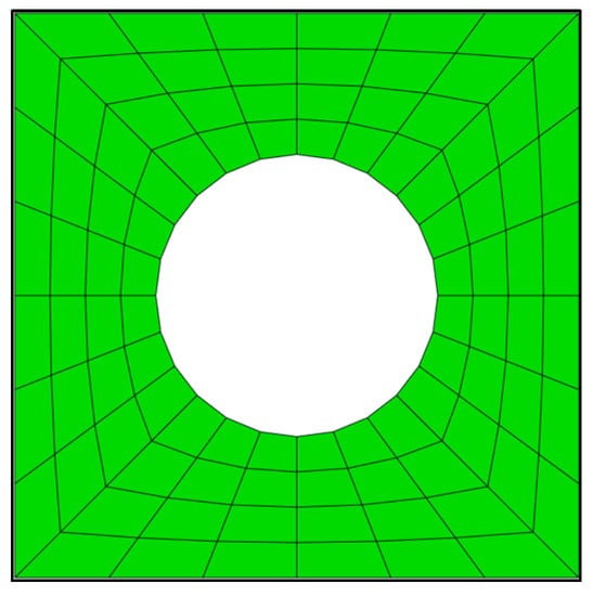 The size of the macroscale elements is , and it is assumed that each macroscale element contains RVEs. The thickness of the multiscale structure is . Thus, the thickness of the RVE mesh is set to according to Equation (8). Due to the applied periodic boundary conditions, an initial guess design of the RVE has to be defined to avoid a uniformly distributed sensitivity field [43]. Here, the initial design is one hole in each RVE, and the radius of the hole is a quarter of the edge length of the RVE. The RVE is discretized into a structured mesh with elements. The Young’s modulus and Poisson’s ratio of the cellular material are and , respectively. Due to the macro elements not contributing to the stiffness in the Direct FE2 algorithm, Young’s modulus of macroscale element is set to . The results of Direct FE2 are compared with the direct numerical simulation (DNS) model.